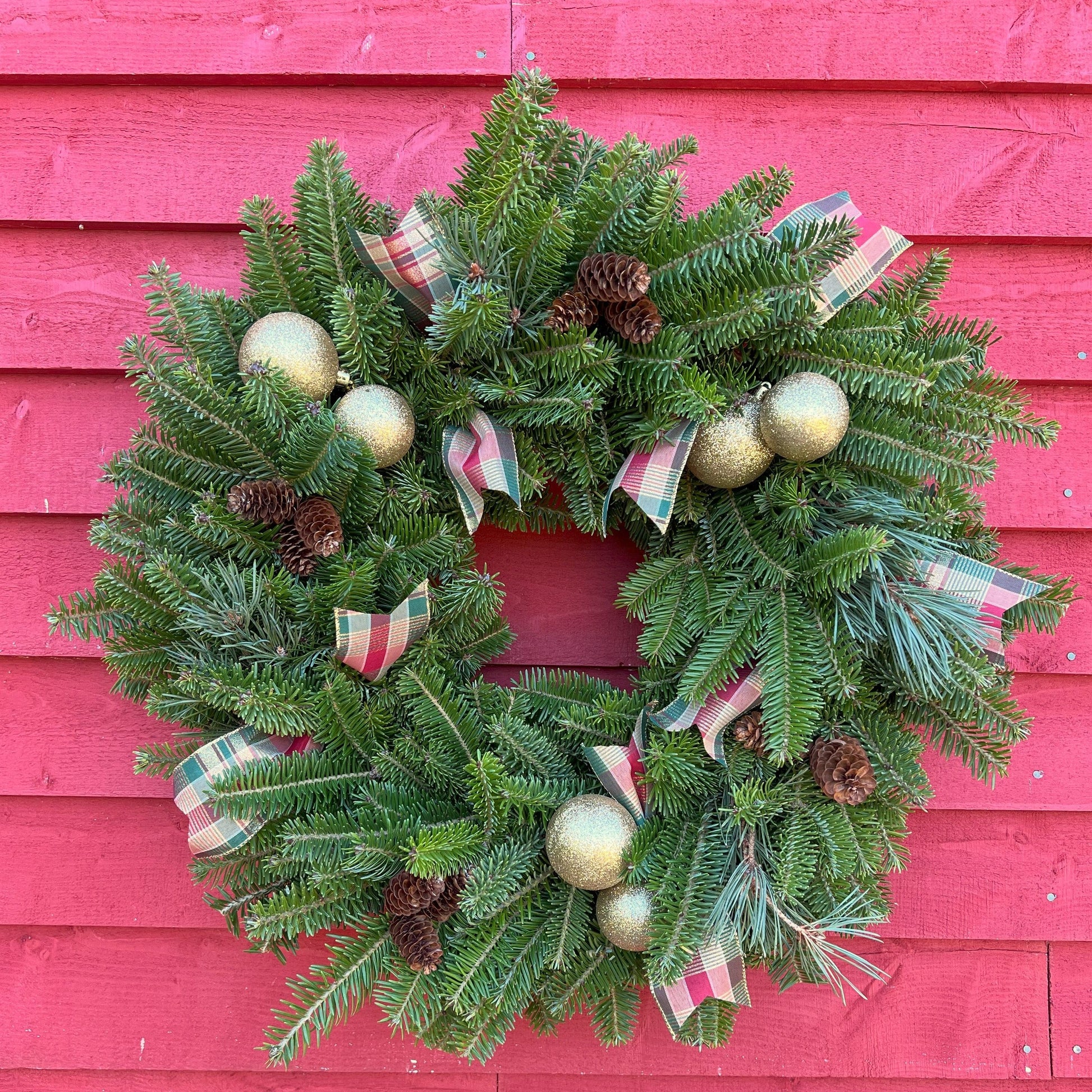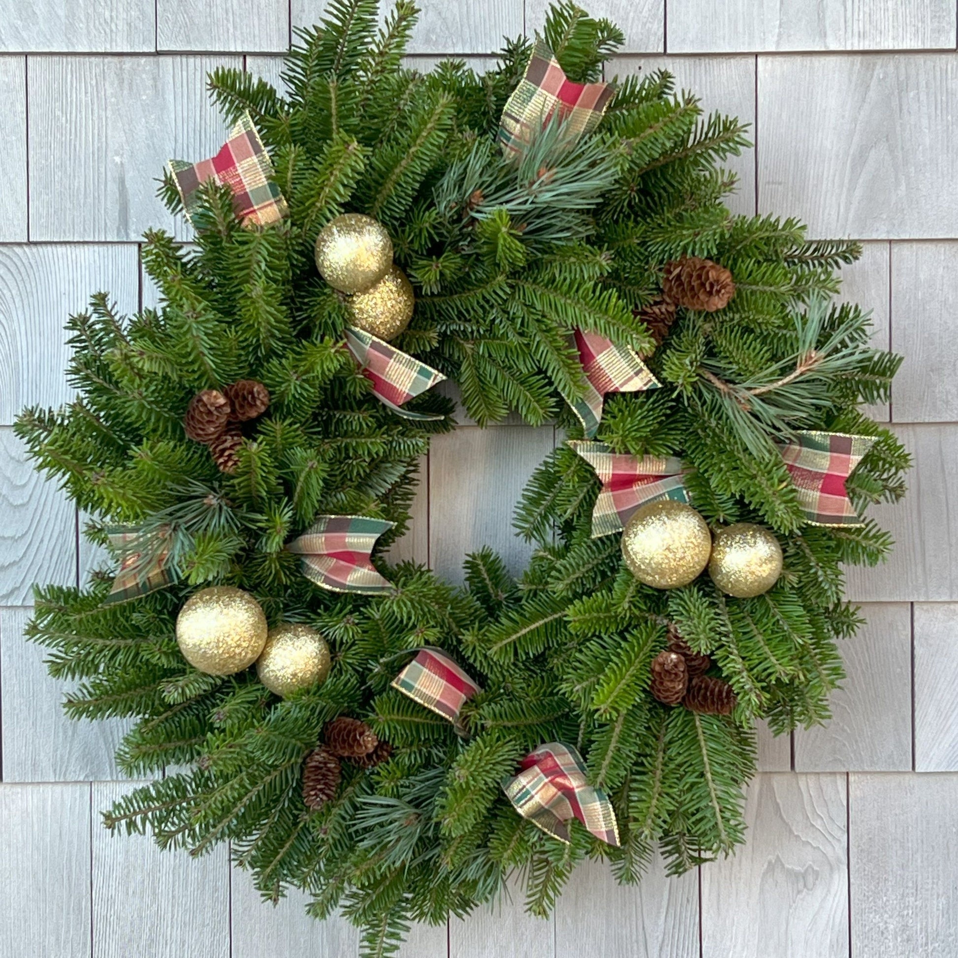 Add some holiday cheer and East Coast charm to your home with the Atlantic Wreath. Adorned with Balsam fir, ribbon strips, decorative balls and natural cones. Available in 24 inch.