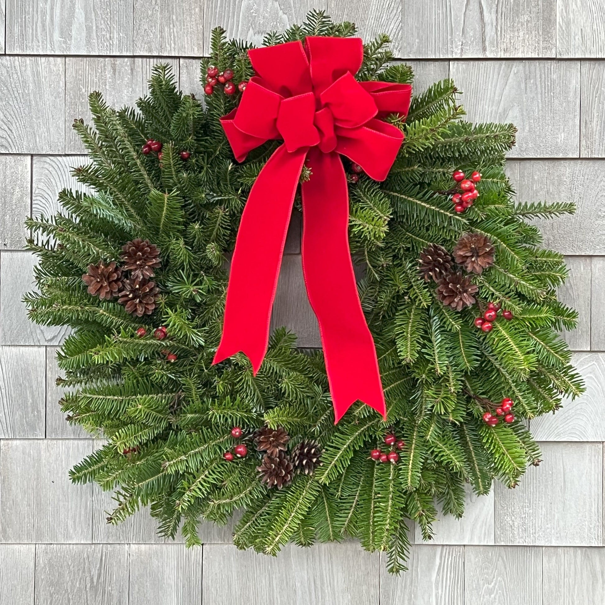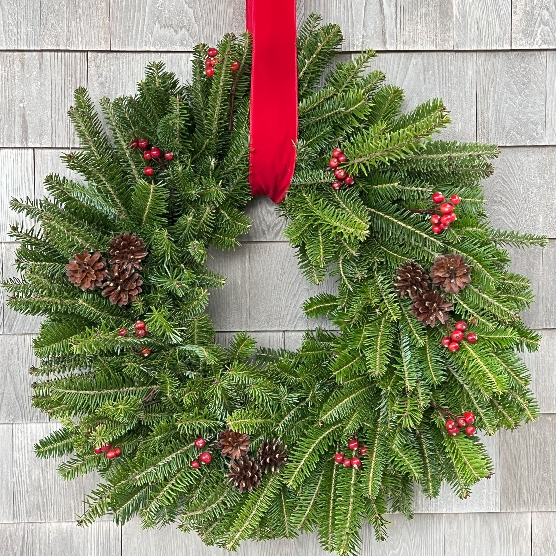 The Traditional is a classic Christmas wreath and our most popular. This fresh holiday wreath overflows with fragrant local Balsam, natural cones and rose hip. Hand harvested locally and finished with a hand tied red bow or ribbon hanger. Available in 24 inch.
